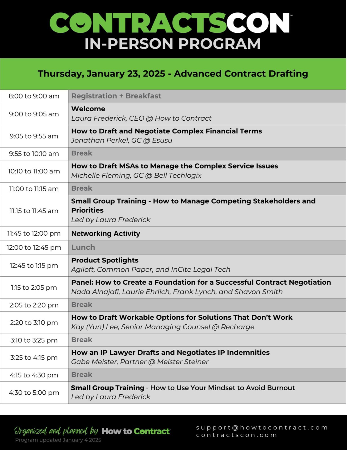Buckle up! Thursday will focus on drafting and negotiating complex commercial transactions. We have five 50-minute training sessions including small group practical drafting exercises and discussion.